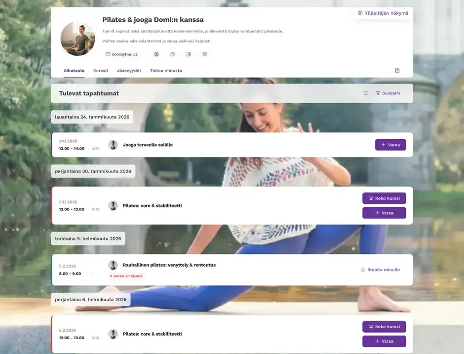 Zenamu on verkkopohjainen alusta studioille, ohjaajille ja ammattilaisille, jotka tarjoavat yksityispalveluja. Se hoitaa ryhmätuntien aikataulutuksen ja 1:1-ajanvaraukset, maksut, asiakashallinnan ja automaattiset ilmoitukset — jotta voit keskittyä siihen, mistä nautit.