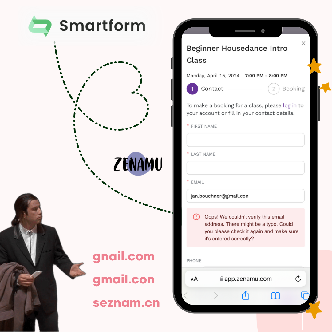 Zenamu now automatically verifies the accuracy and existence of the email provided, alerting clients to potential errors before they complete their booking.