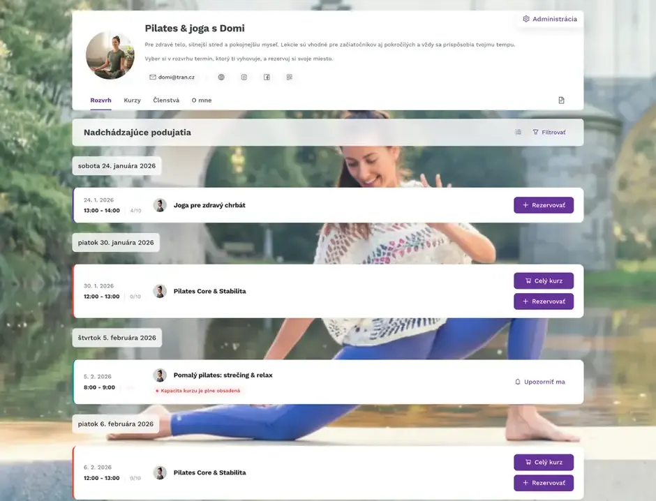 Nastavte si členstvá presne podľa svojich potrieb – s neobmedzeným vstupom alebo s limitom počtu lekcií za deň, týždeň či mesiac. Dĺžku členstva si volíte sami a klienti majú všetko vyriešené jednou platbou, takže sa nemusíte starať o jednotlivé rezervácie ani platby.